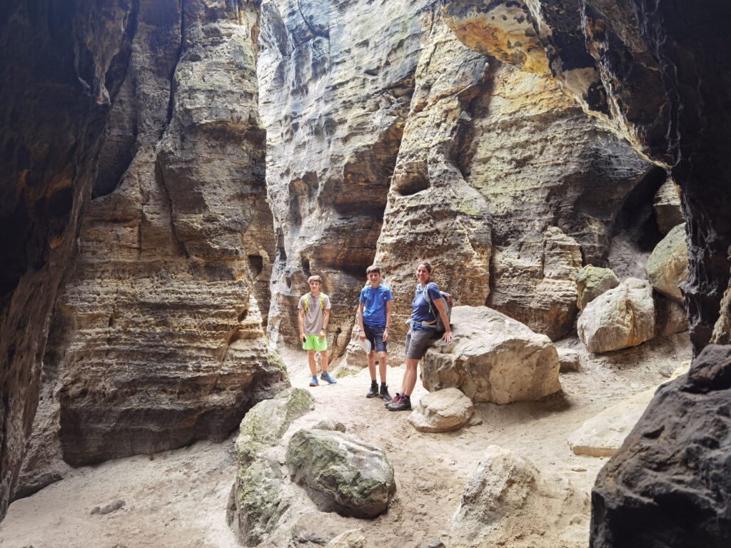 Der komplette Rundweg, der die Großen und Kleinen Wände verbindet, sieht von oben aus wie eine liegende Acht, und den würden wir jederzeit wieder machen. Aber falls du nicht so viel Zeit hast oder einfach nur die besonders markanten Felsen samt dem Felsenlabyrinth erkunden willst: der kurze Rundweg durch die Kleinen Tyssaer Wände ist genial. Du schaffst ihn locker in einer guten Stunde, je nachdem, wie oft du stehen bleibst, um Fotos zu machen (und das wirst du oft!).
